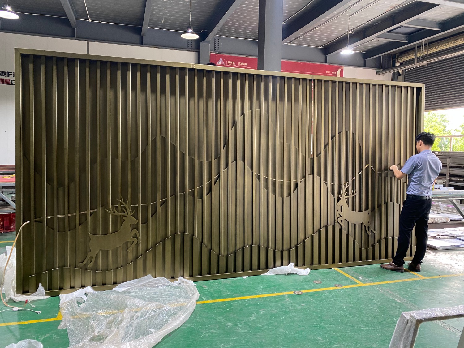 鋁藝影壁墻,端莊大氣,格調(diào)不凡,百年不銹,不開裂,不變形,不褪色,免維護,安裝方便簡單??筛鶕?jù)客戶圖紙要求現(xiàn)定制。
